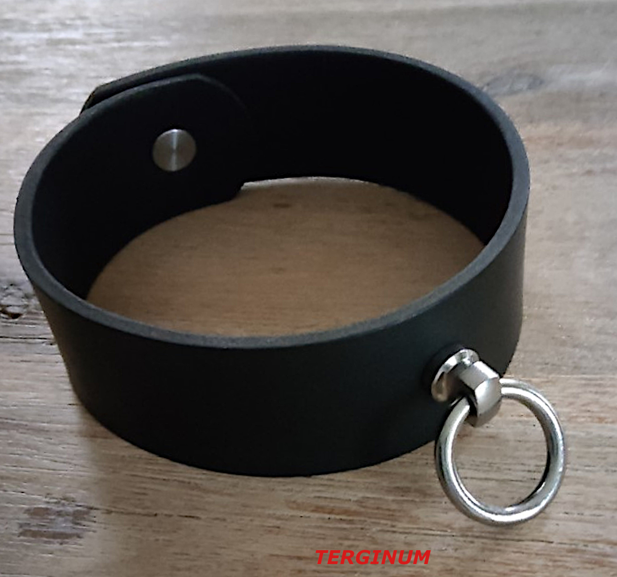 Hochwertige Halsfessel aus robustem Rindsleder - vorne mit einem großen Premium O-Ring aus Edelstahl ausgestattet.