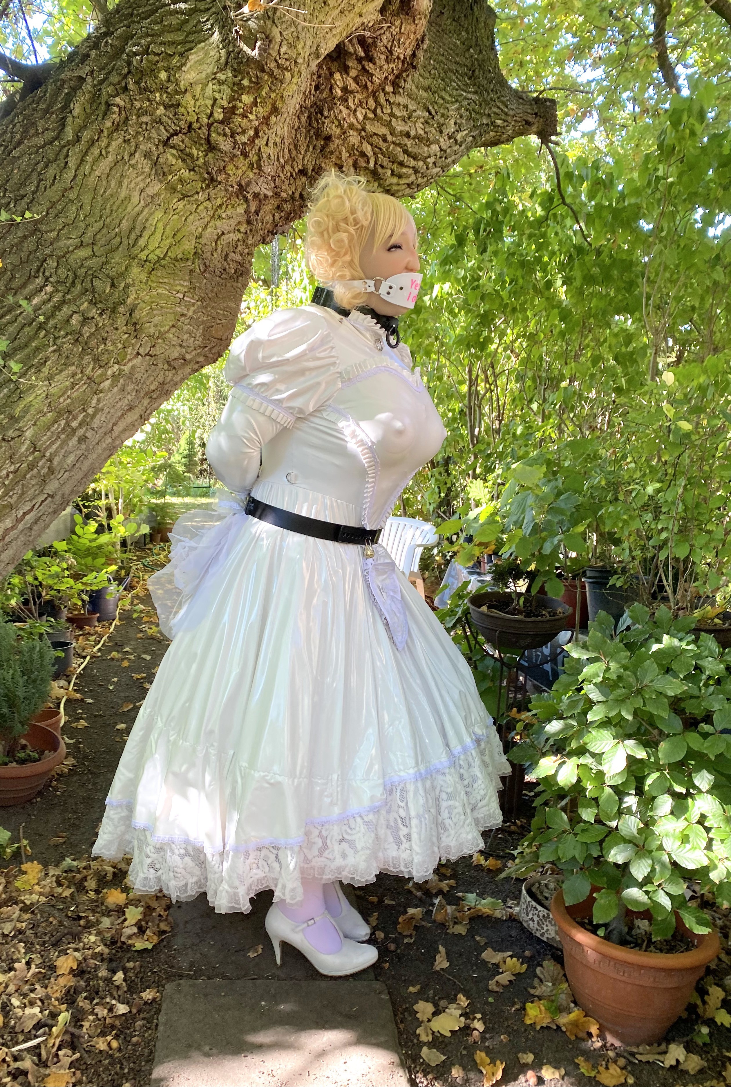 Handcrafted, sturdy bondage harness with an adjustable belly band and two handcuffs to hold the arms behind the back.